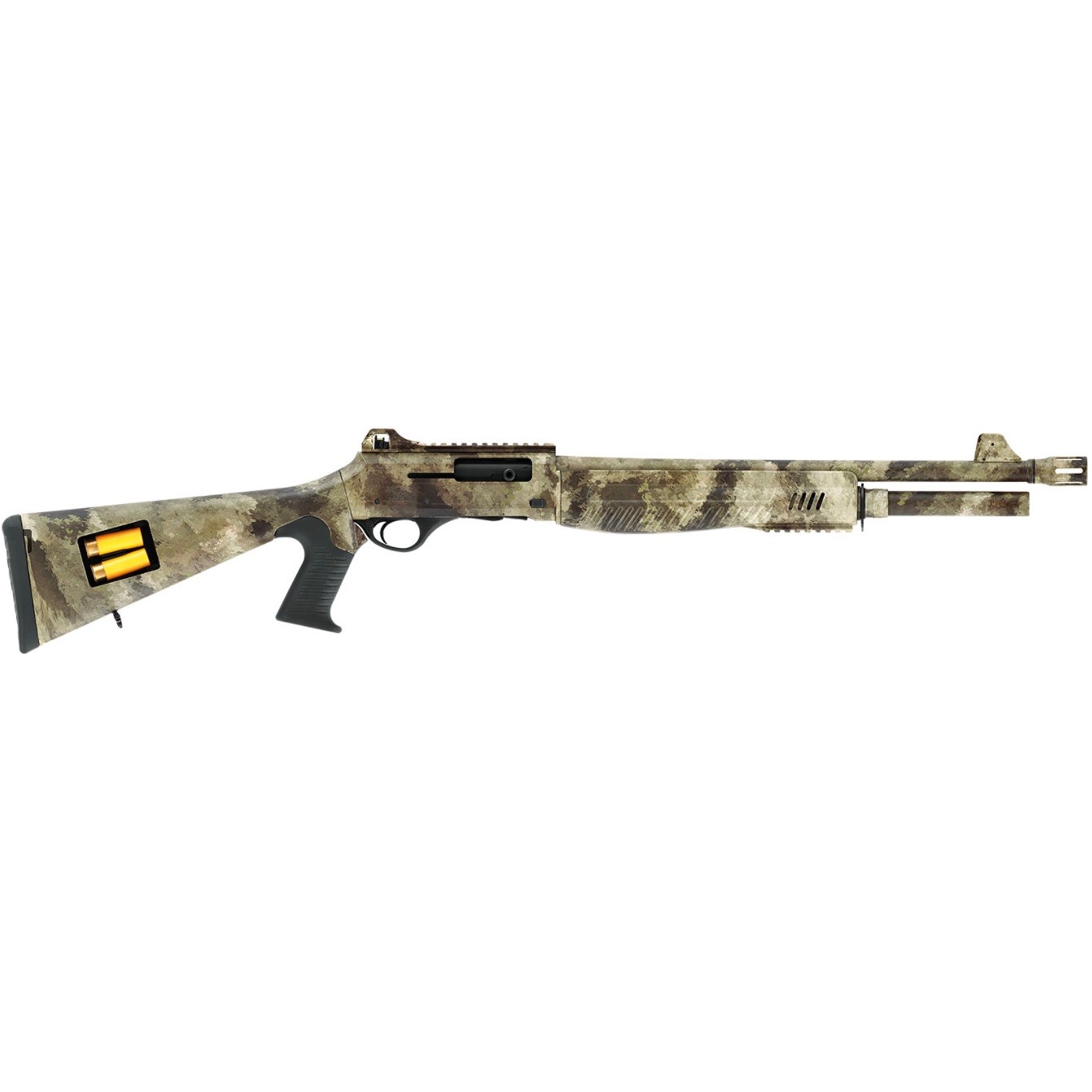 Riel Picatinny. Culata de polímero con patrón de camuflaje con alojamiento para 2 cartuchos y pistol grip integrado.