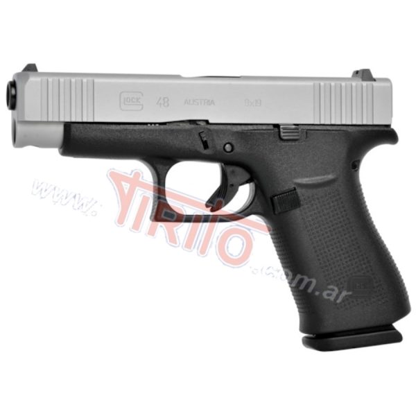 La pistola semiautomática GLOCK 48 es mono hilera, para que sea delgada y compacta para una mejor capacidad de ocultación interna. El sistema de disparo “Safe-Action” hace que disparar en situaciones estresantes sea infalible. El agarre de polímero de textura rugosa proporciona una sujeción sólida. La corredera presenta un acabado plateado PVD y estrías delanteras y traseras. El alza y guion de punto blanco proporcionan una adquisición rápida del objetivo en situaciones de poca luz.