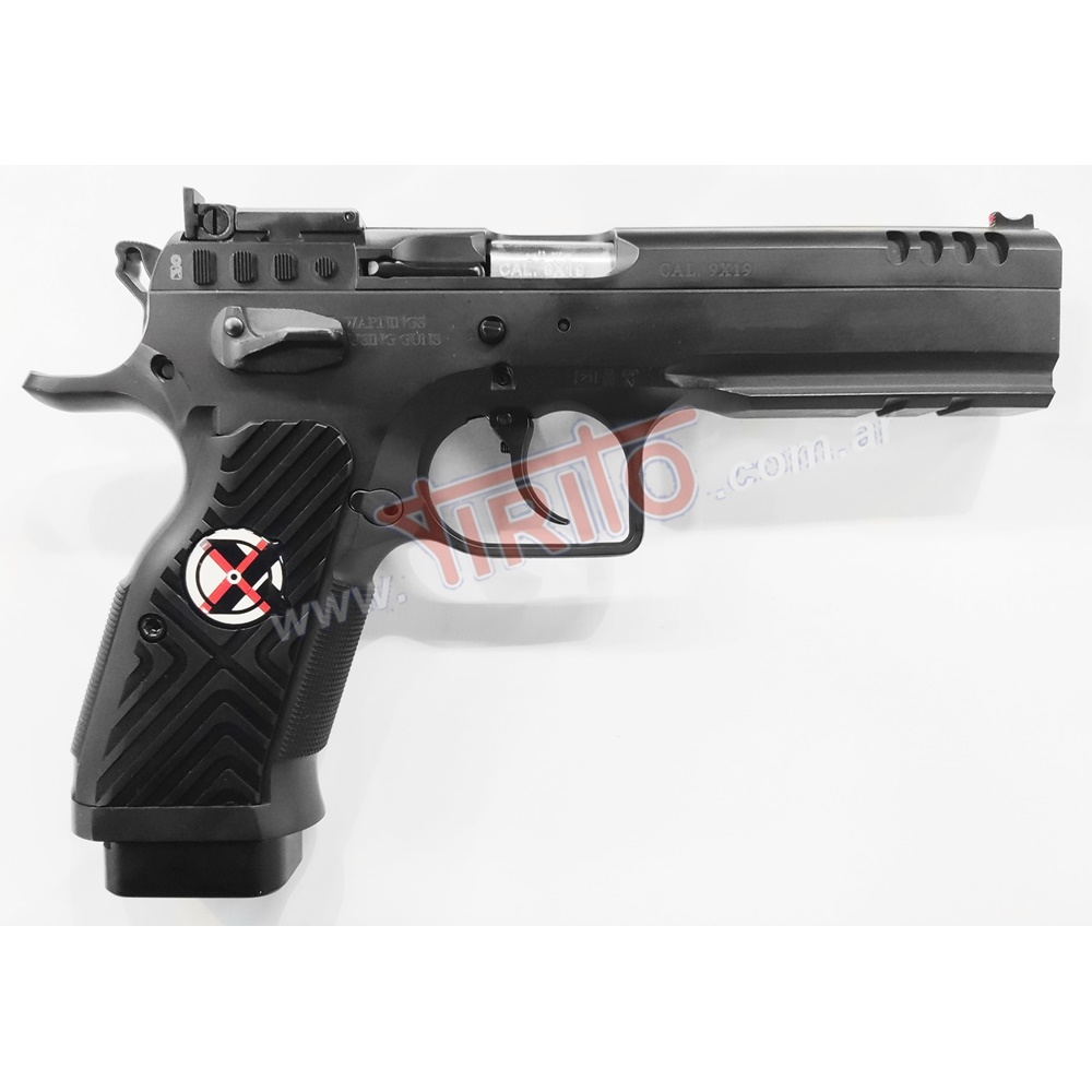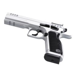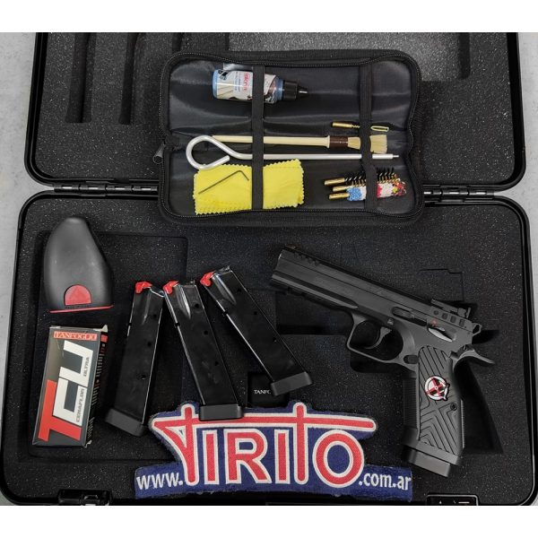 Se entrega en su estuche original Tanfoglio, con 4 cargadores, kit de limpieza, obturador de recamara, llave allen, destornillador para alza y manual. Tiene colocado Martillo Titan y terminación de pintura Cerakote.